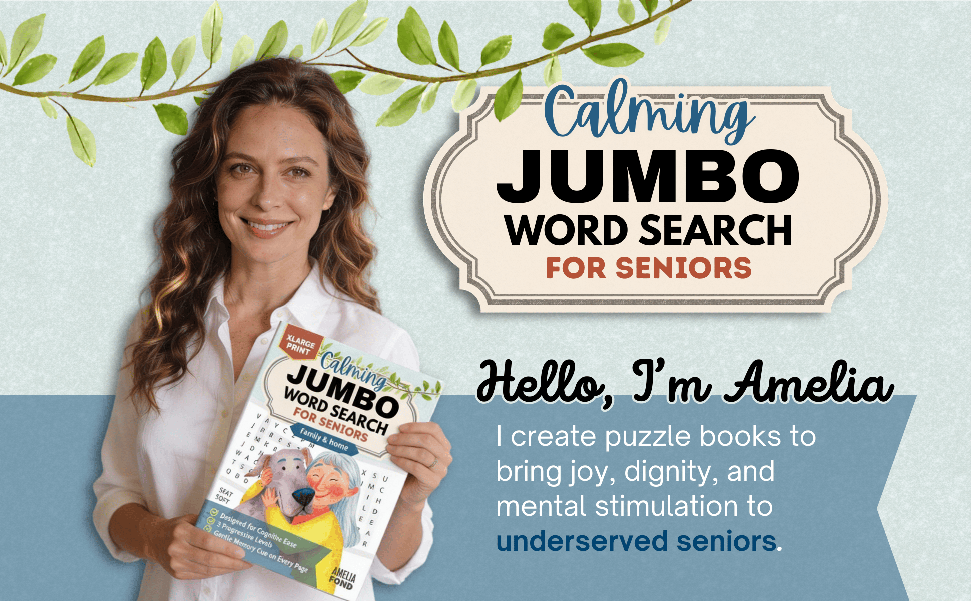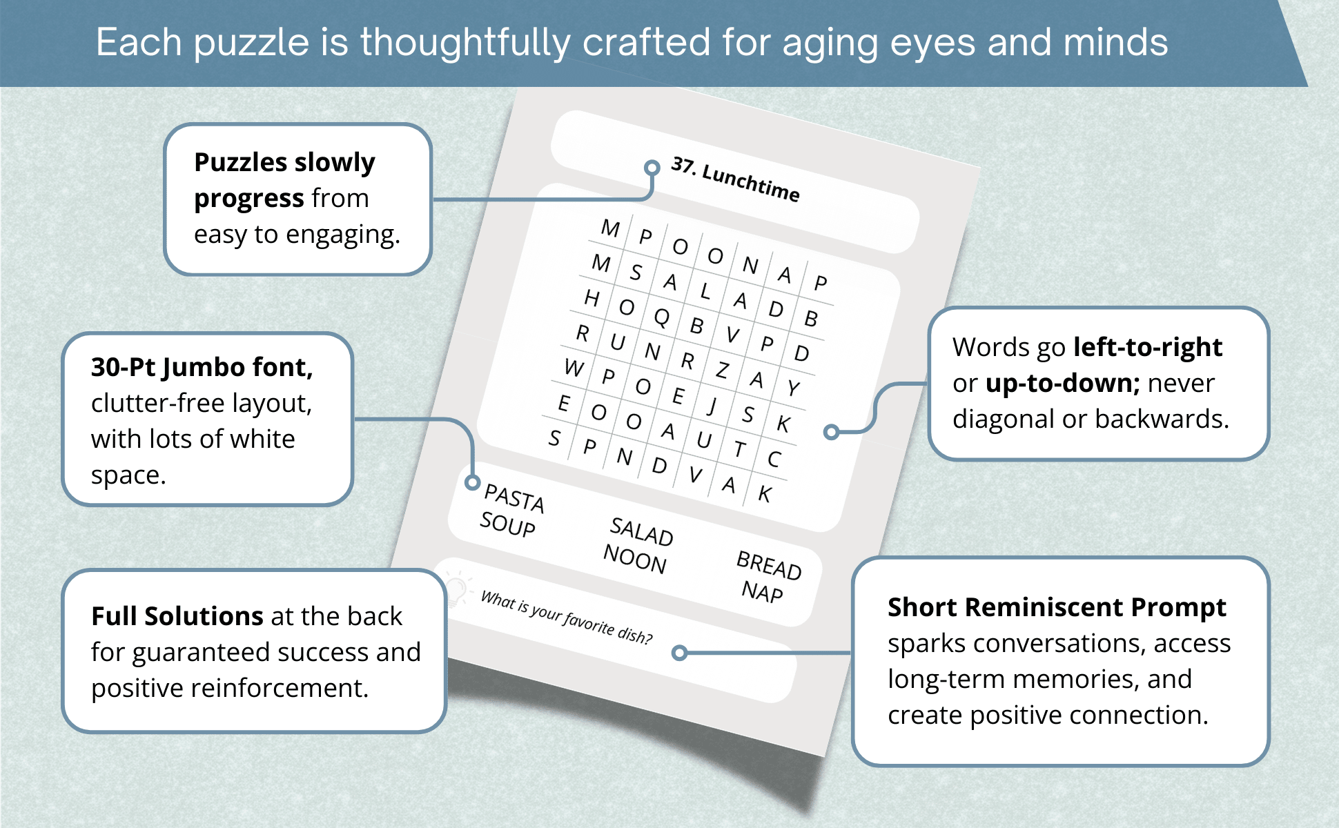 It’s a word search book, but not like the ones you might remember from the grocery store checkout line. This one was designed with a specific person in mind: someone who might be navigating the early stages of memory loss, who needs things to be gentle and clear, who deserves to feel capable and comforted, not frustrated or talked down to.